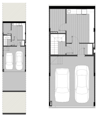 Garaje privado para dos coches con acceso directo a la vivienda, zona de servicios y trastero.